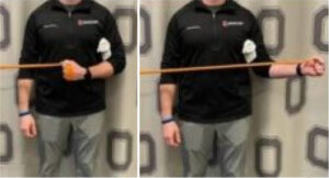 Com o cotovelo dobrado e o braço ao seu lado, coloque uma toalha enrolada entre o braço e o lado do corpo, rode o braço para fora contrariando a resistência de uma TheraBand. Volte lentamente para a posição inicial e repita. Mantenha o cotovelo ao seu lado e os ombros direitos. “Aperte” as suas omoplatas enquanto roda para fora.