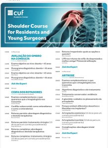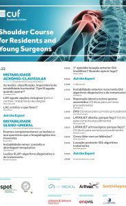 Nos passados dias 21 e 22 de Novembro tivemos a honra e o prazer de partilhar um pouco da nossa experiência no tratamento cirúrgico de roturas da coifa e instabilidade anterior do ombro, no Shoulder Course for young surgeons and residents, organizado pela equipa de Cirurgia do Ombro do Hospital Cuf Descobertas. Agradecemos ao Dr. Diogo Silva Gomes e restante equipa, e ainda à CUF Academic Center pelo convite. Trata se de um excelente curso, inovador e completo, que permite a partilha de conhecimento de forma aberta e participativa, com benefício de todos os participantes.